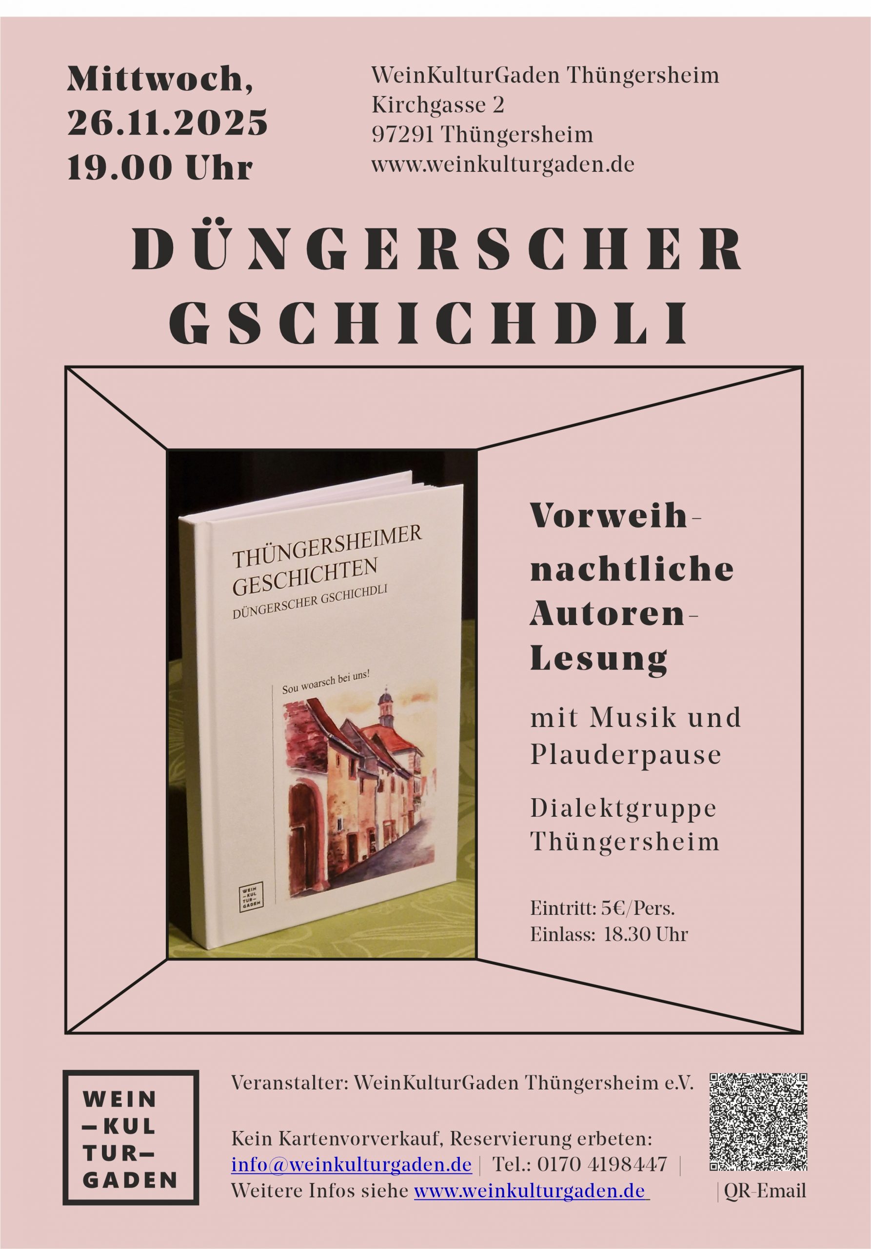 Das im Frühjahr 2024 erschienene Buch „Düngerscher Gschichdli“, dessen didaktische Konzeption bei der Preisverleihung besonders hervorgehoben wurde, bietet speziell für Unkundige einen besonderen Service in Form von Übersetzungen in normale deutsche Sprache der teils lautschriftlich verfassten Dialekt-Texte. Gedruckt sind beide Textfassungen „übersetzungs“-komfortabel auf jeweils gegenüberliegenden Buchseiten. Der vorweihnachtliche „Düngerscher-Gschichdli“-Lesungsabend in den WeinKulturGaden wird durch Musik und eine Plauder-Pause zum Schöppeln und Naschen bestimmt recht unterhaltsam werden, die Dialektgruppe lädt hierzu herzlich ein!